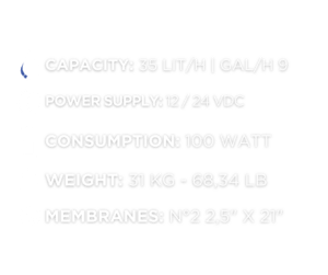 This Schenker watermaker is ideal for a crew of 1-4 people, in 30-40 feet sailboat or in 25-35 feet powerboat or catamaran. The capacity is 35 lit/h (9 Gal/h); consumption is just 110 watt. 12-24 VDC power supply.