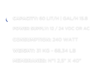 This Schenker watermaker is ideal for a crew of 4-6 people, in 35-45 feet sailboat or in 30-40 feet powerboat or catamaran. The capacity is 60 lit/h (15.8 Gal/h); consumption is 240 watt. 12-24 VDC power supply.