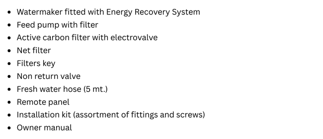 QUBE 65 s the ideal watermaker for a crew of 5-6 people , in 40-50 feet sailboats or 35-45 feet powerboats or catamarans. Its capacity is 65 lit /h (17 Gal/h) ; its power consumption is 300 watts. 12-24 VDC power supply